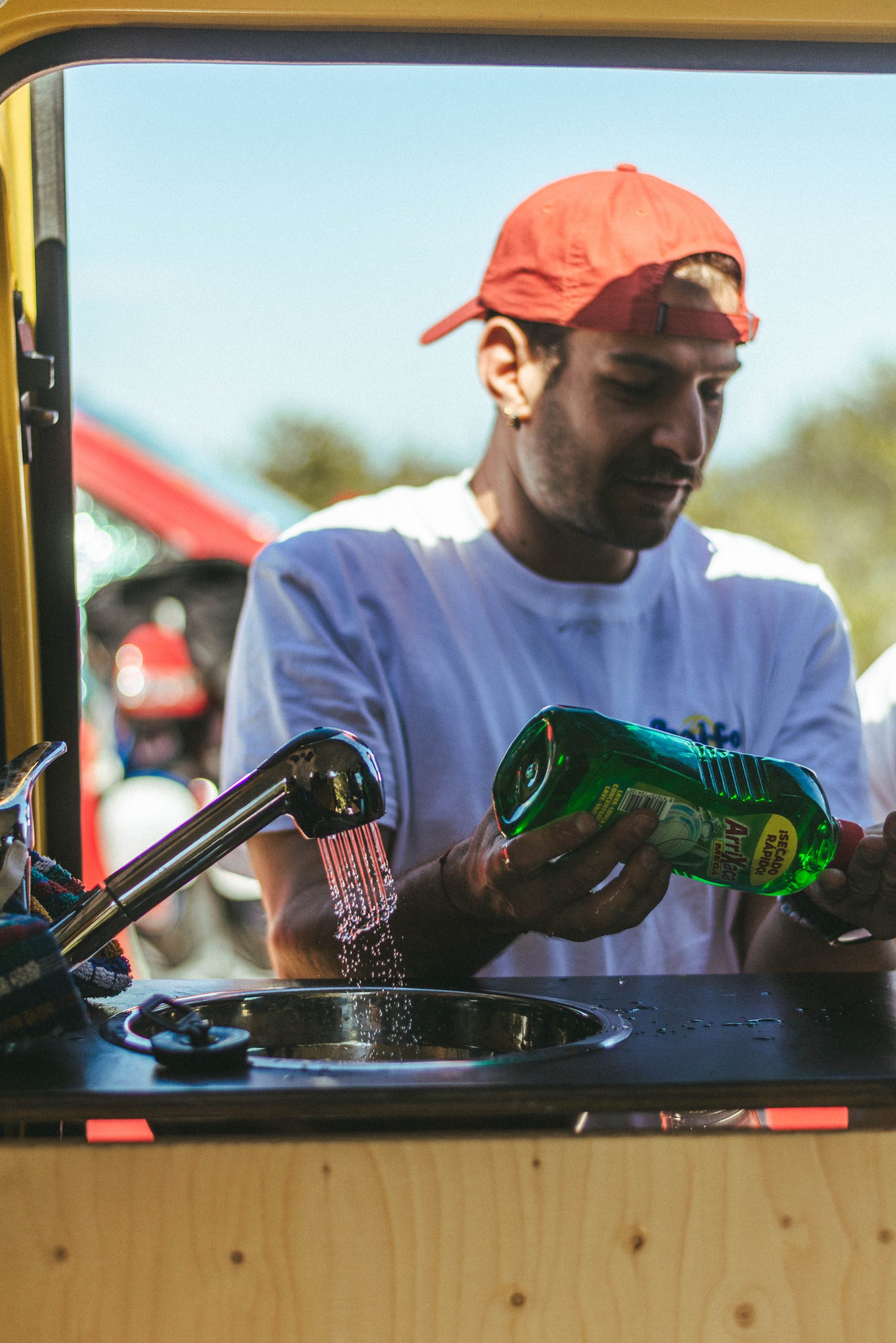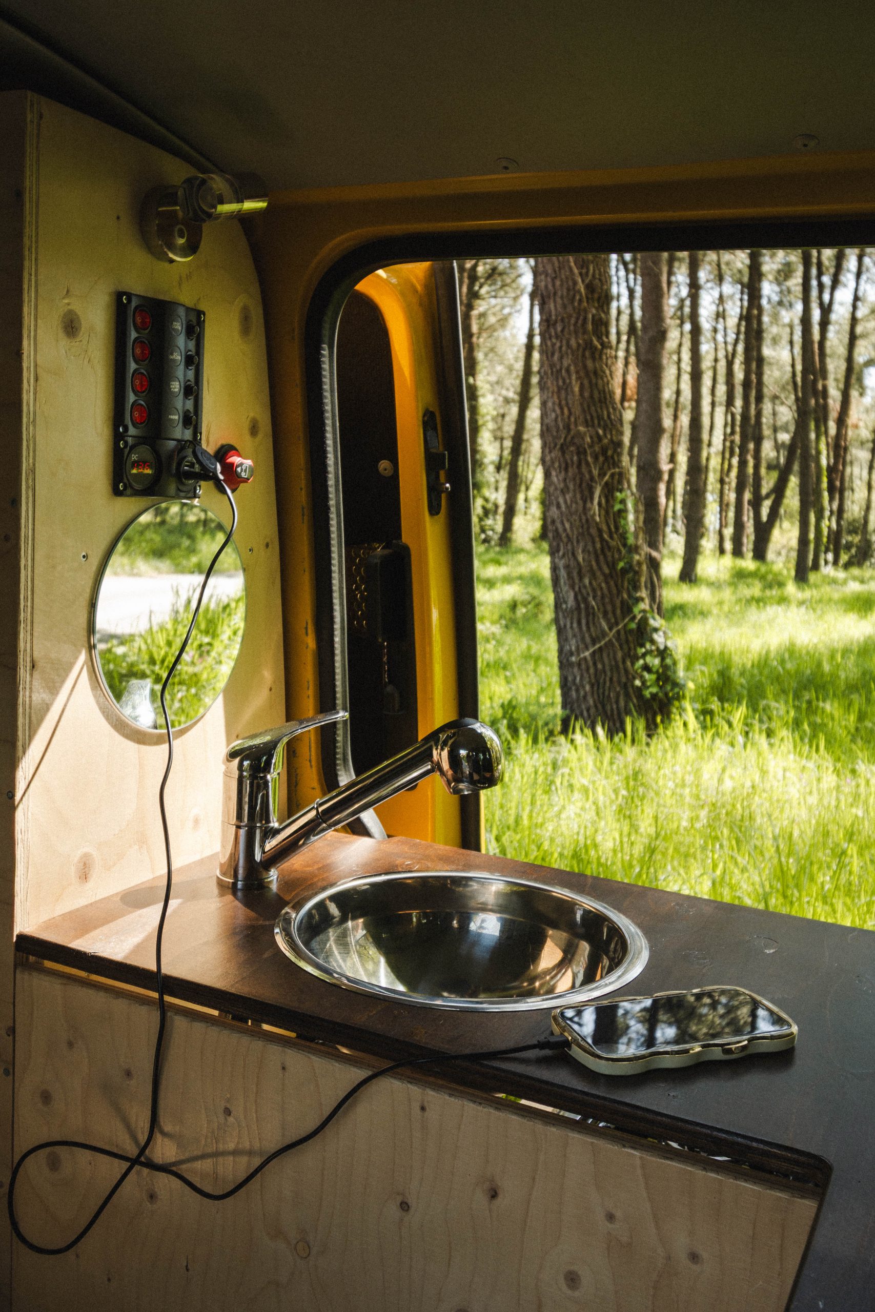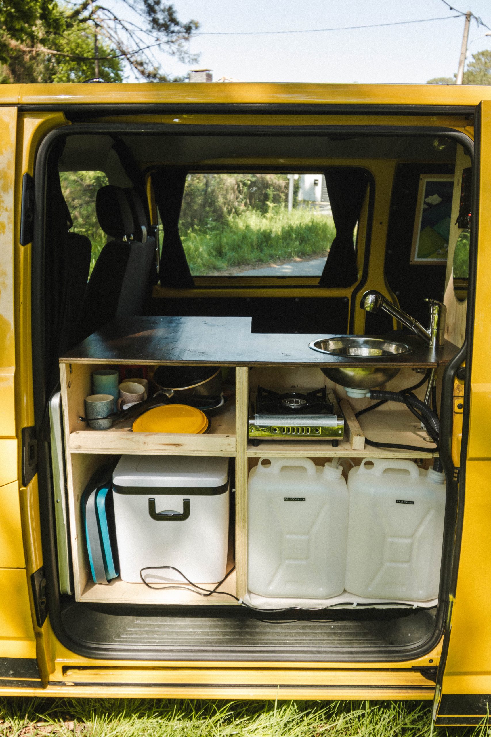 La cuisine latérale, très fonctionnelle, est conçue pour cuisiner à l’intérieur ou sur le coté du van. Elle est équipée d’un véritable réfrigérateur de 20 litres et de tous les ustensiles de cuisine. Vous avez également la possibilité de vous doucher grâce à la douchette extérieure.